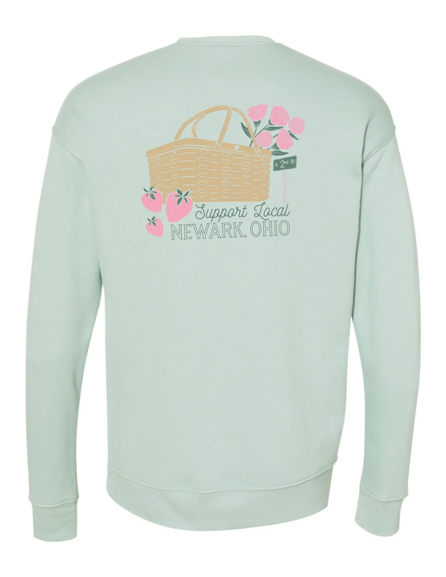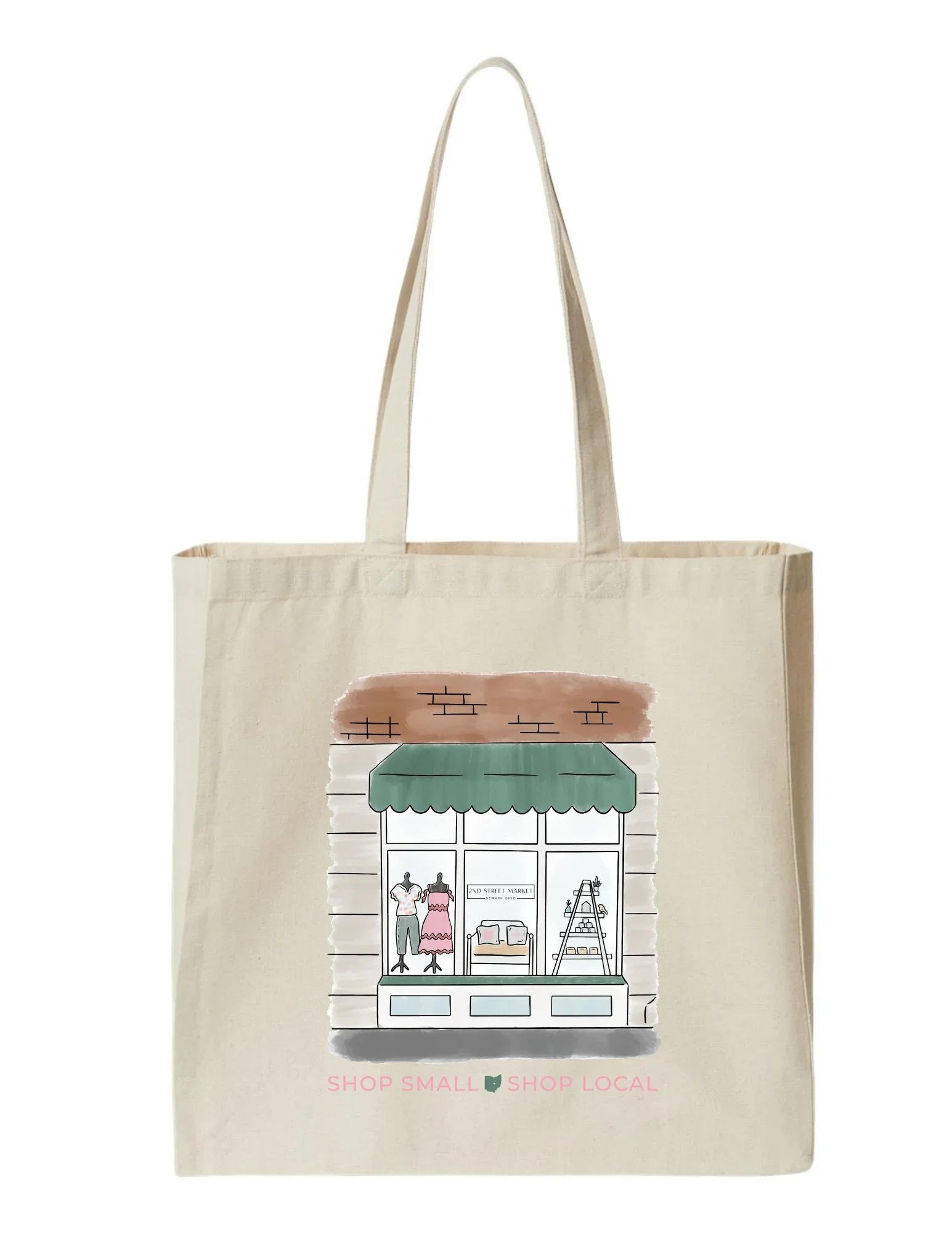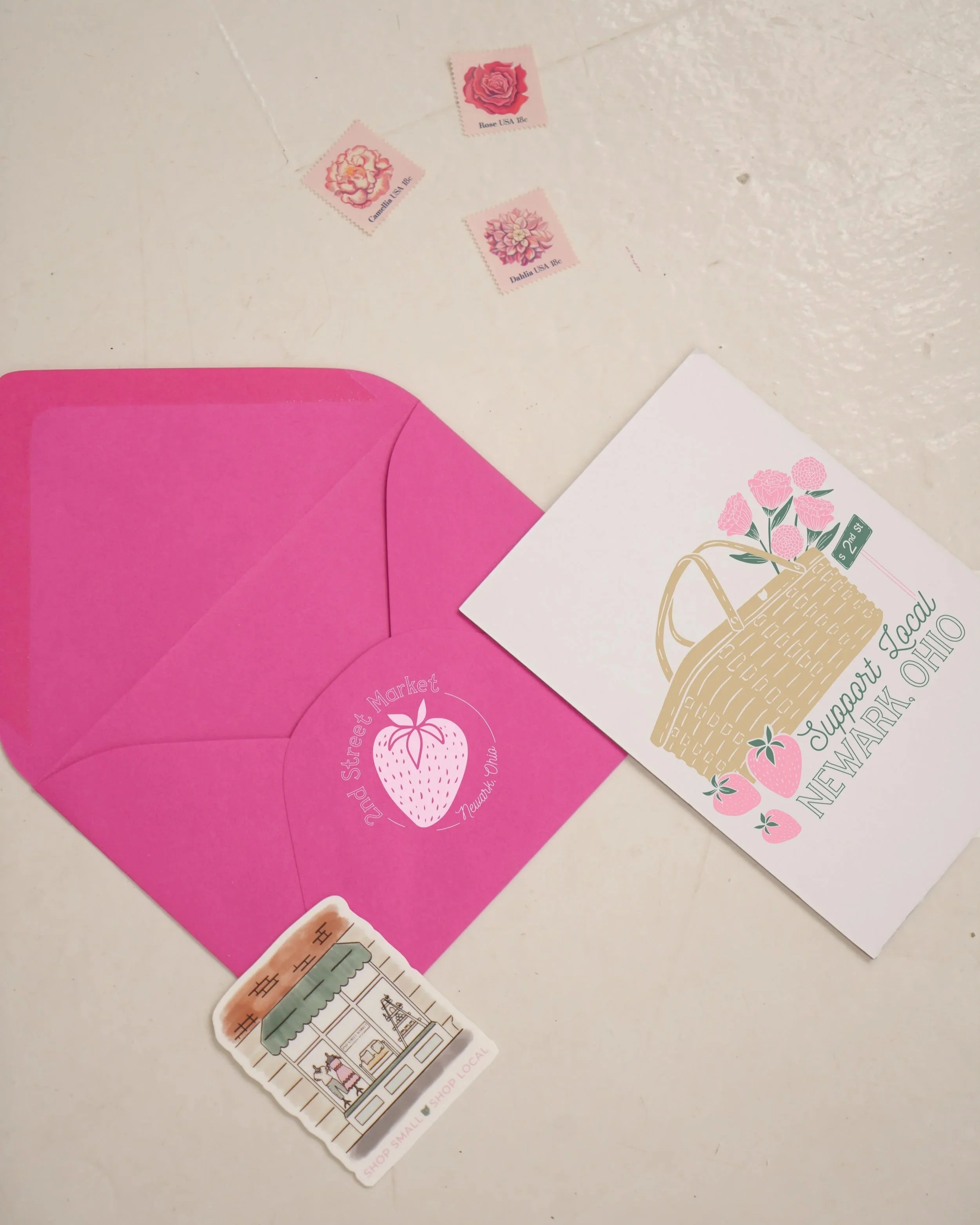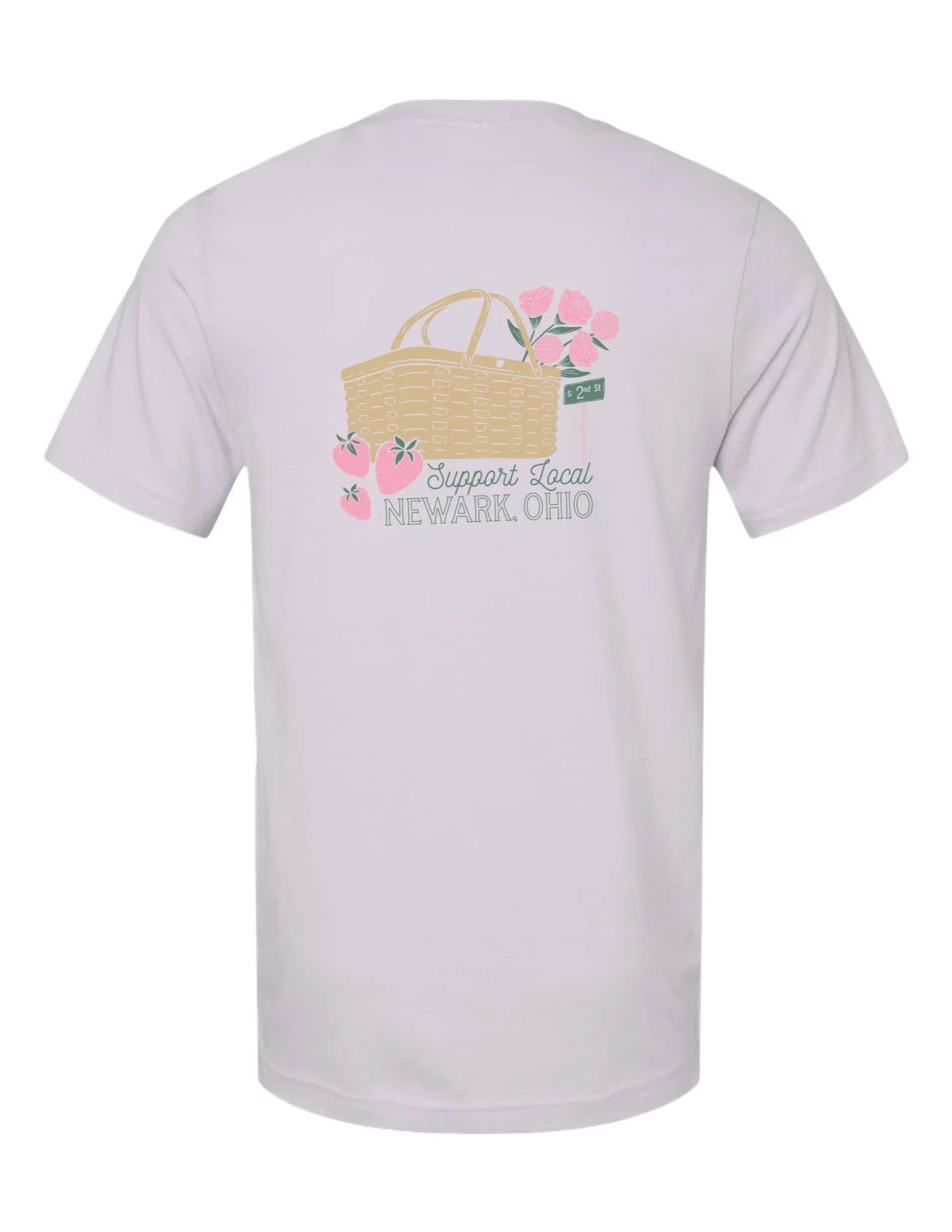 Emily of 2nd Street Market, a cute gift shop and boutique in Newark, Ohio, hired me to create some custom artwork for their business birthday celebration! One of the designs is a custom storefront illustration complete with textured color and a hand drawn aesthetic. This artwork was utilized on stickers and totes for the celebration! In addition to the storefront illustration, Emily wanted to add new graphic t-shirts to their collection. After a brainstorming session, we decided to feature some Newark elements in a design that promotes shopping and supporting the community. I included a picnic basket which is a nod to the iconic basket in Newark, along with carnations that are the state flower, and a street sign since the store is found on 2nd Street! This birthday celebration occurred in May so I tied in strawberries and springtime colors to match the season.