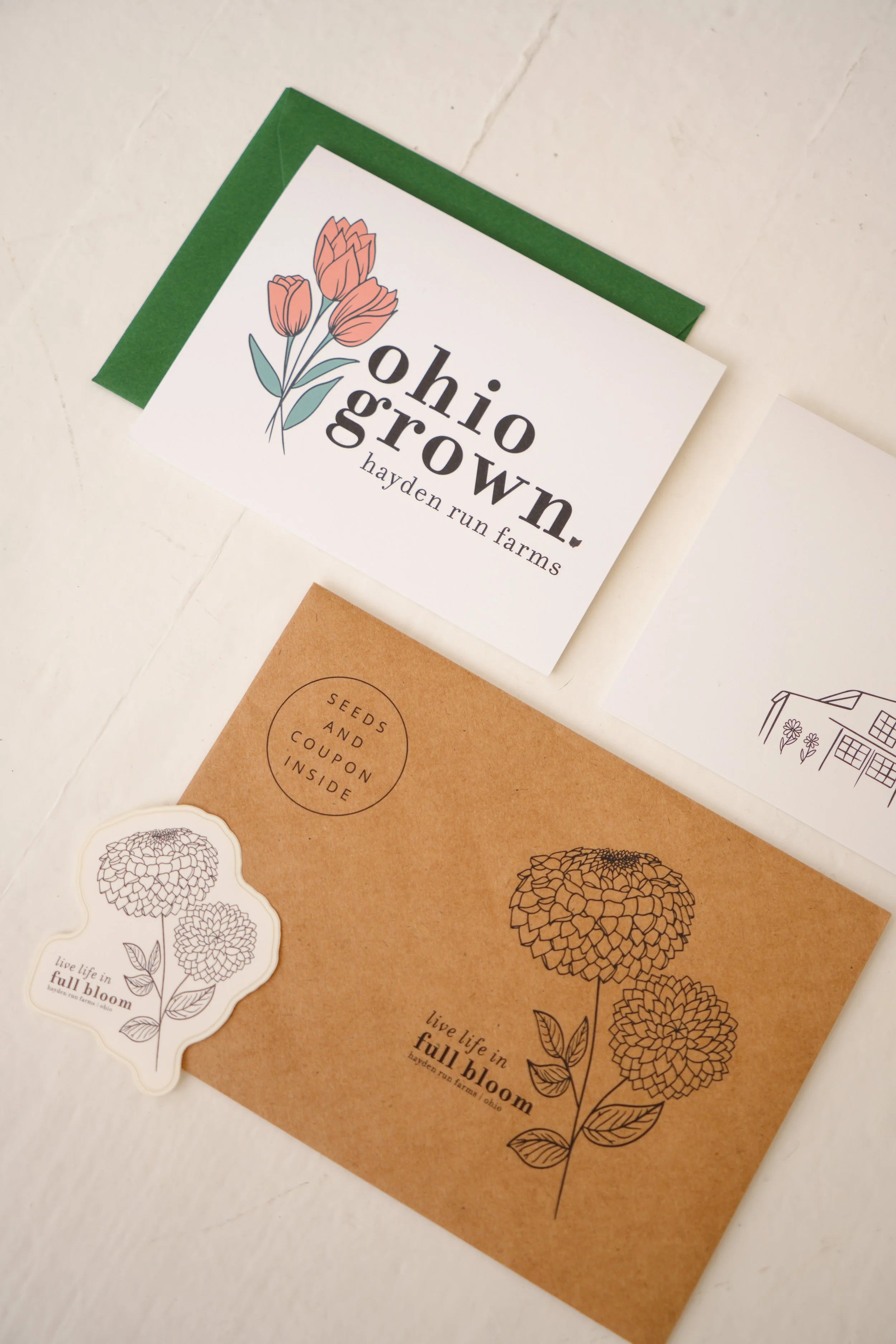 Hayden Run Farms is a beautiful flower farm located in Plain City, Ohio. Paula commissioned me to create some custom artwork to be used for t-shirts, stickers and seed packets for the farm. One of common flowers found on the farm is the dahlia which is featured in the artwork.