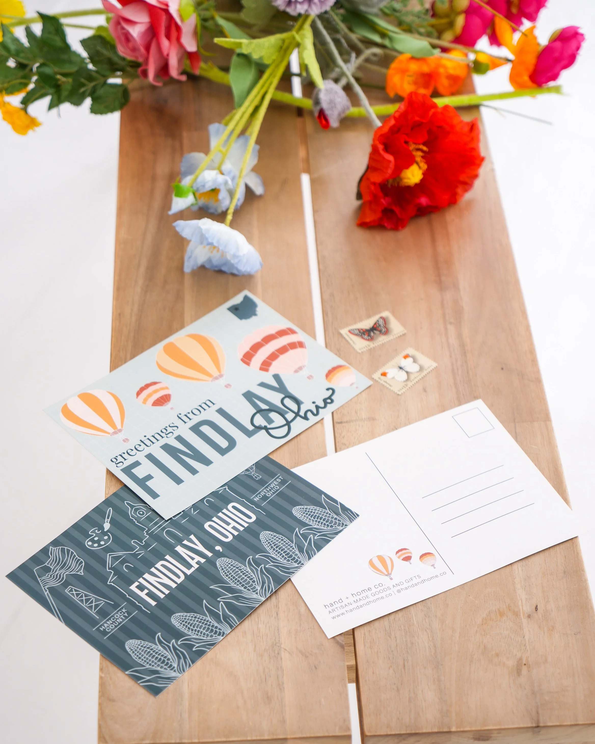 Custom design projects for Hand & Home Co. in Findlay, Ohio including a boutique drawing, solar eclipse products, postcards and more.