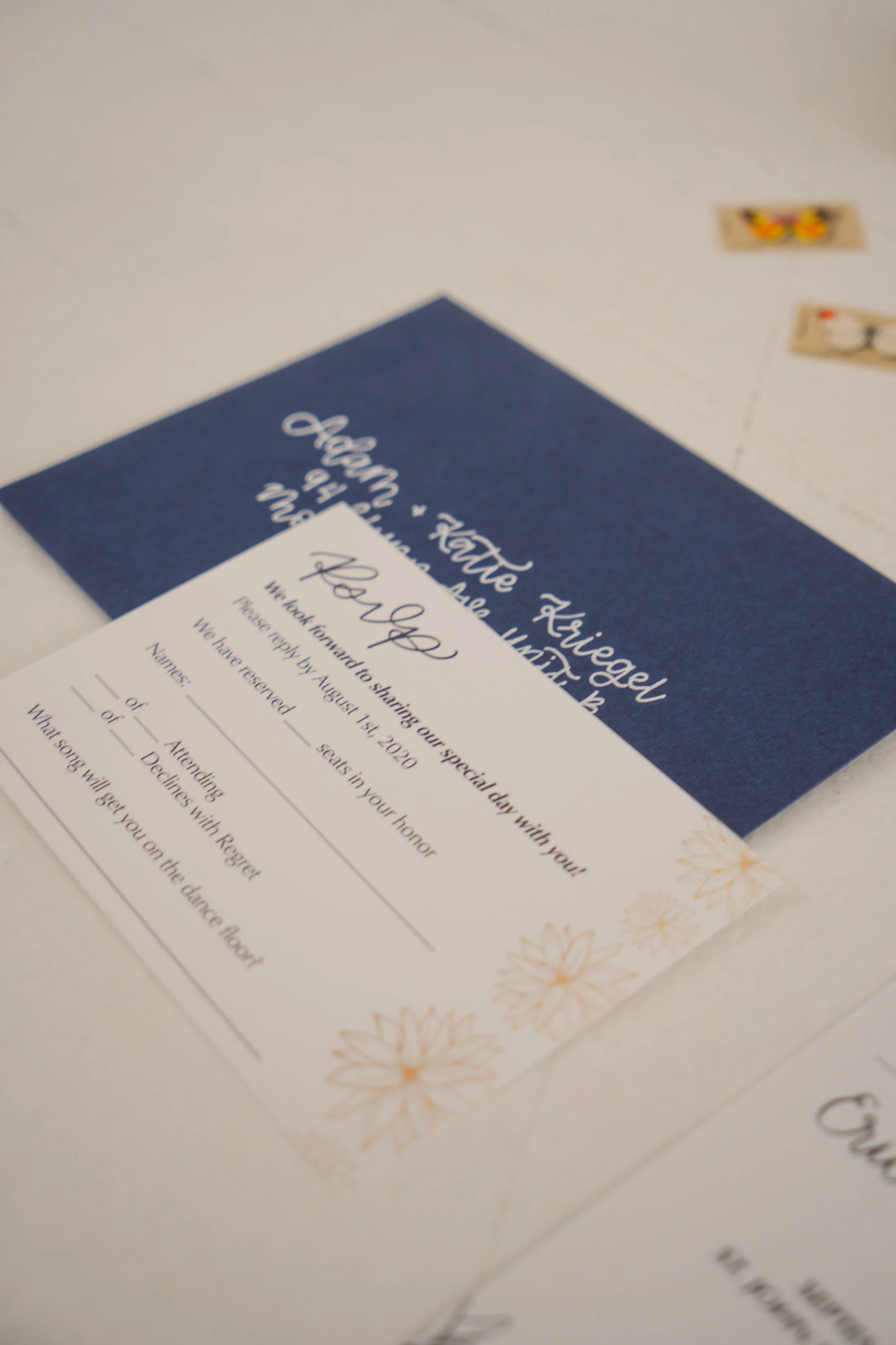 A minimal sunflower set of wedding stationery based upon a gold and navy color palette. This suite included Save the Dates, a Formal Invitation, Details card, RSVP cards, Bridal Shower Invite and Prayer Cards, Signage, Table Numbers, Wedding Program, Thank You Cards, and Cloth Face Masks. The bride’s bouquet was filled with sunflowers so I carried the digitally drawn flowers through the entire suite while keeping it elegant and simple with line art.