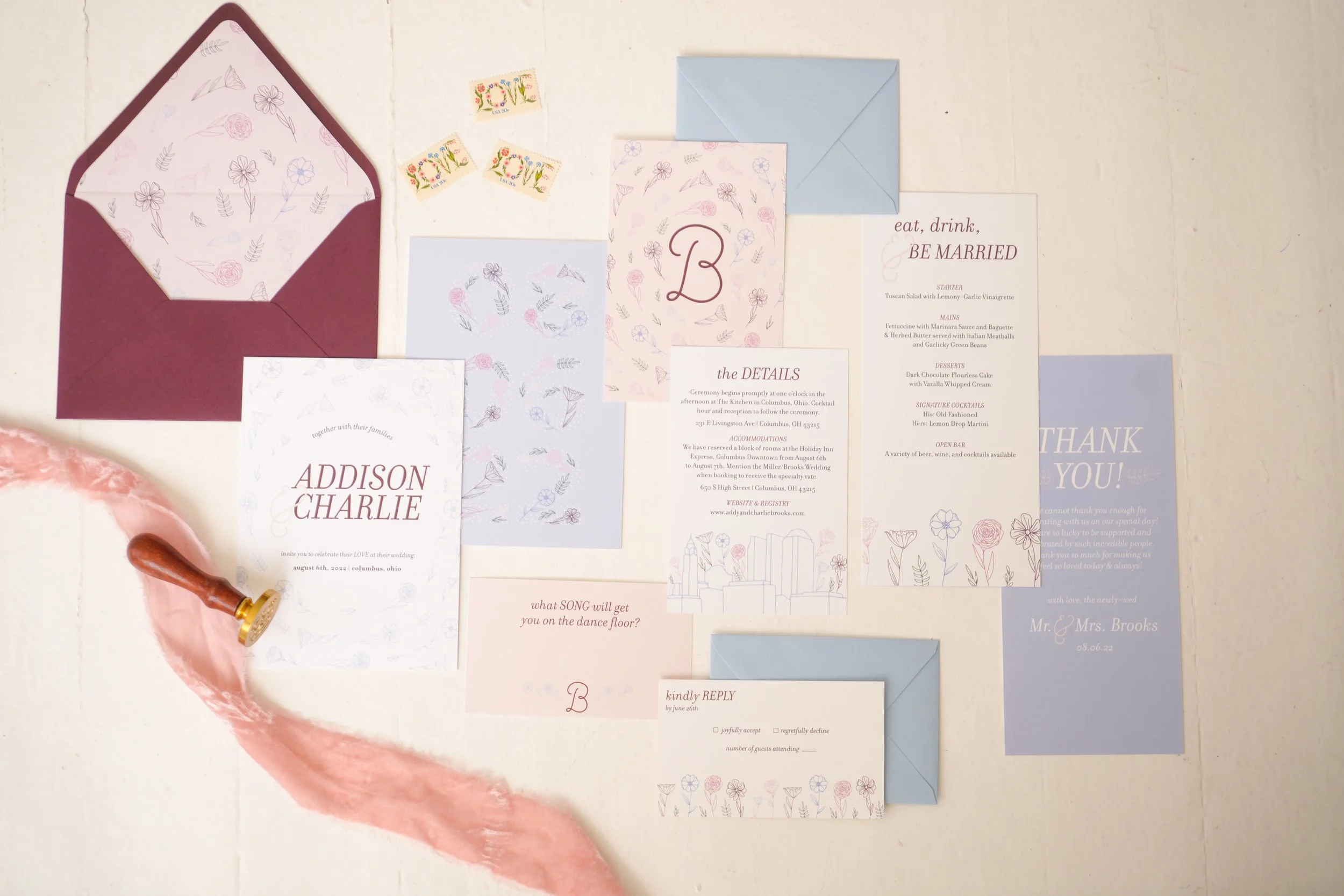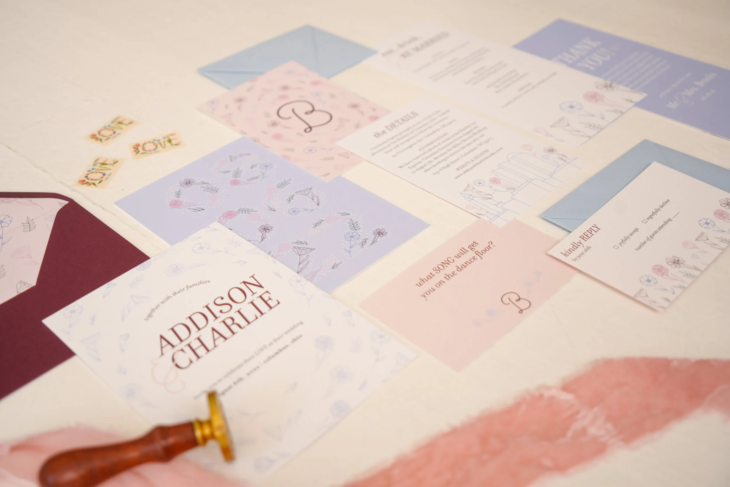 This sample suite was used for a styled shoot where I was provided with the color palette and inspiration. I utilized some brighter floral colors to match the aesthetic of this late summer wedding that featured fun florals. Suite included formal invitation design, details card, RSVP card, envelope liner, wax seals and menu design.